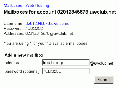 You should now see your main mailbox details. To add a new one, enter your chosen email address and password. You can use the same password as for your main address or choose a new one. If you leave it blank then one will be chosen for you.