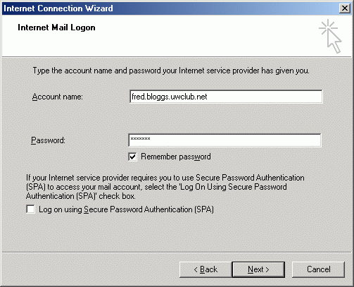 Refer to the note you made earlier of your new mailbox settings. Enter your username in the "Account name" box, and your password below it. Tick the "Remember password" box. Leave the last box un-ticked and click on the "Next" button.